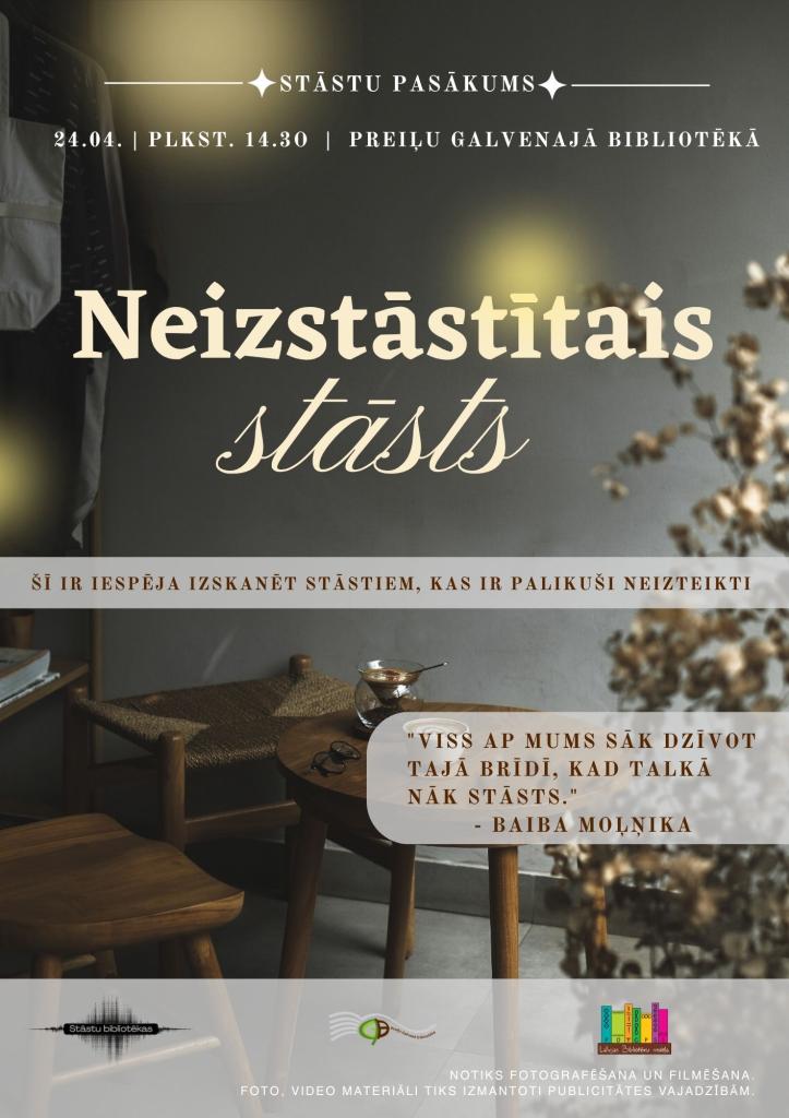 Aicinām 24.aprīlī plkst.14.30 uz stāstu pasākumu "Neizstāstītais sāsts". Iespēja izstāstīt stāstu, kas ir palicis neizteikts.