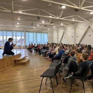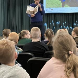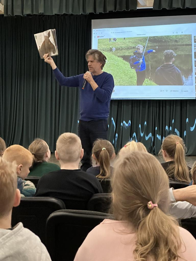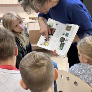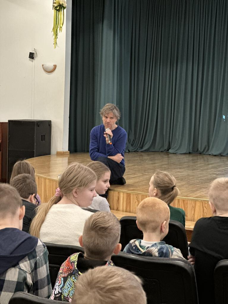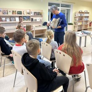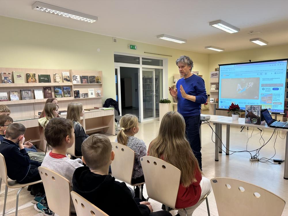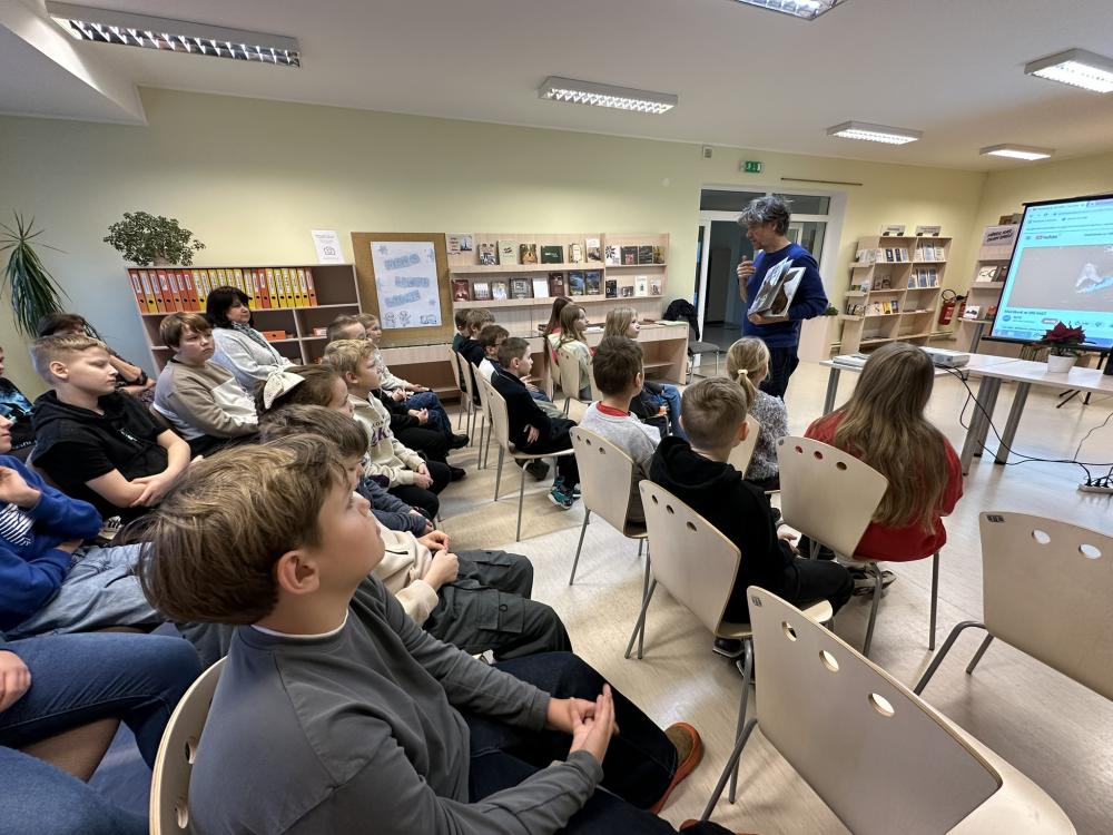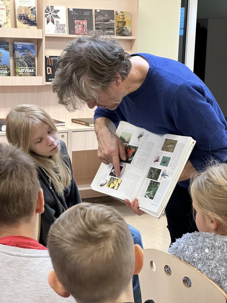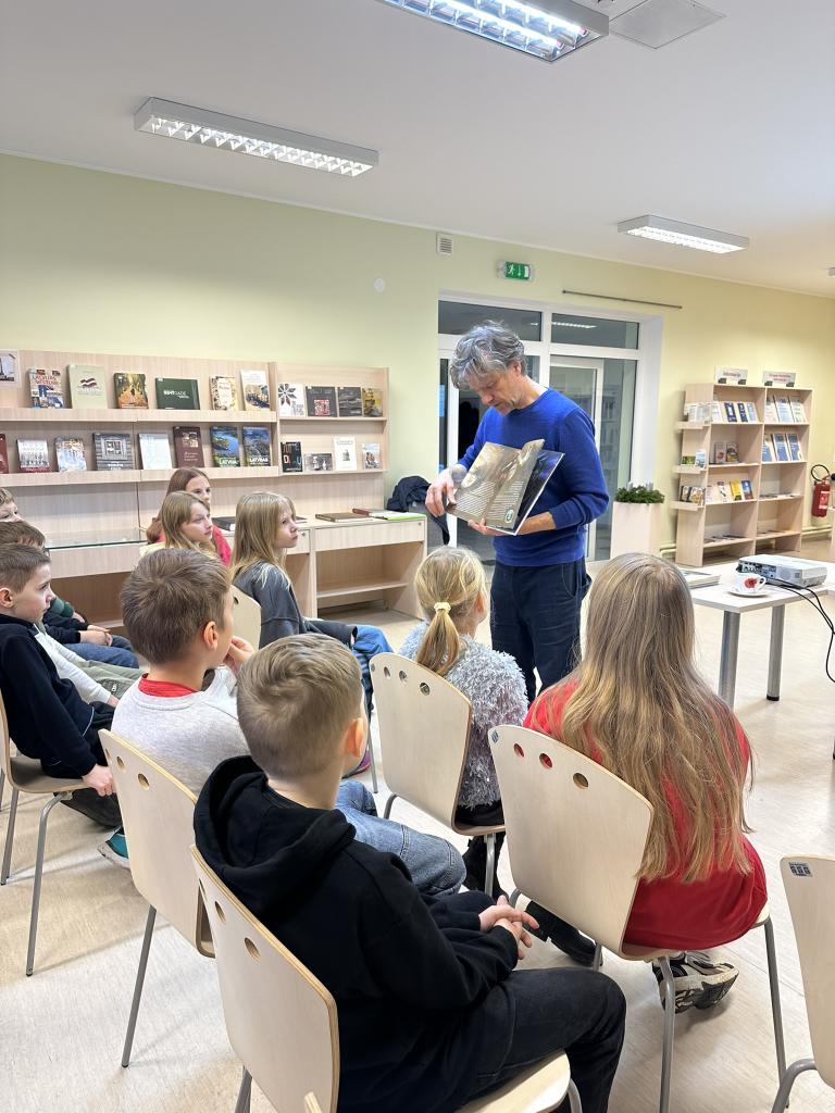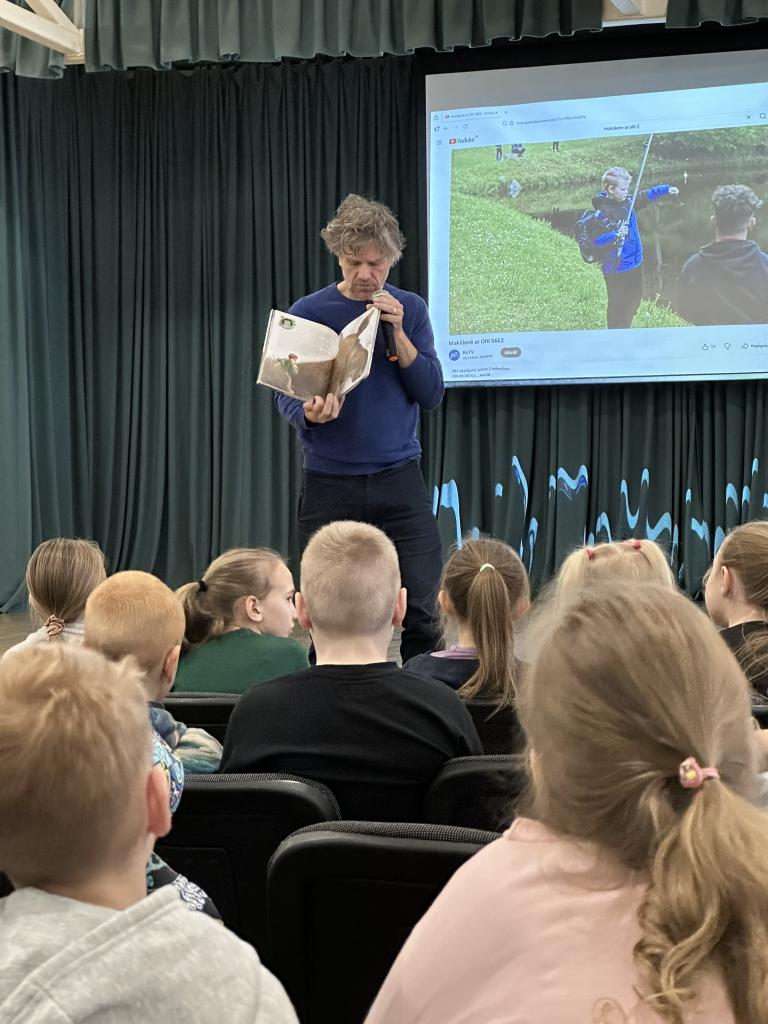 Māris pastāstīja par lasīšanu dabā, par savas grāmatas “Matīsa piedzīvojumi mežā” tapšanas procesu un saviem novērojumiem dabā. Skolēni uzmanīgi klausījās, uzdeva jautājumus un aktīvi iesaistījās sarunās.