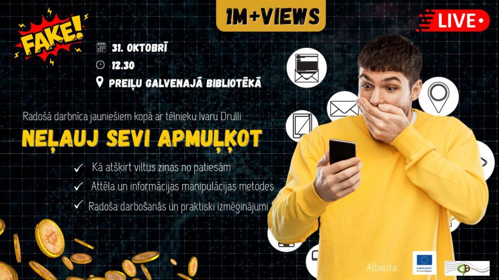 | Mākslinieks un tēlnieks Ivars Drulle caur radošām aktivitātēm mudinās jauniešus aizdomāties par tādām tēmām kā viltus ziņas un attēla manipulācija. Radošais process tiks balstīts uz fragmentiem no grāmatām, avīzēm, izgriezumiem - tā būs iespēja praksē izmēģināt attēla un informācijas manipulācijas metodes.