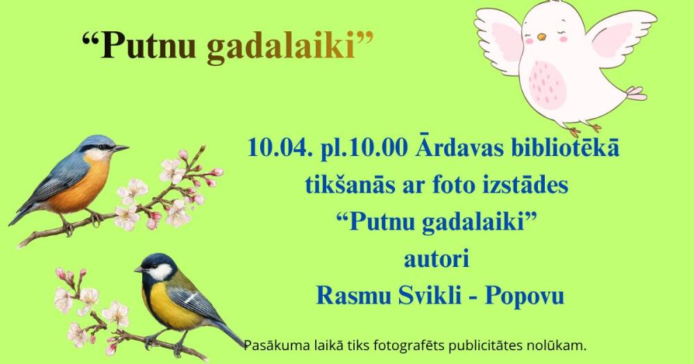 | 10. aprīlī plkst. 10.00 Ārdavas bibliotēkā tikšanās ar fotogrāfiju izstādes "Putnu gadalaiki" autori Rasmu Svikli - Popovu. |